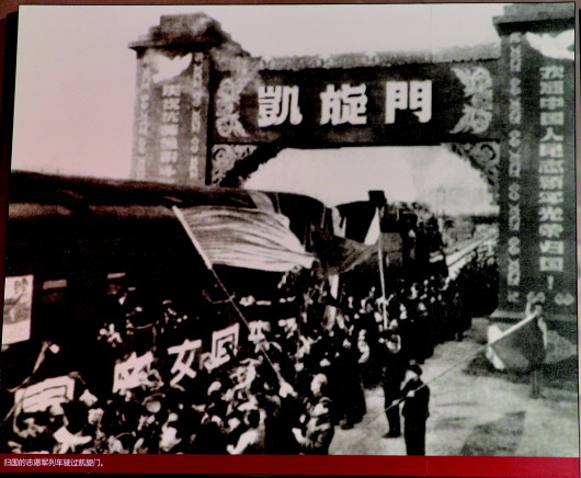 歸國的志愿軍列車駛過凱旋門。
